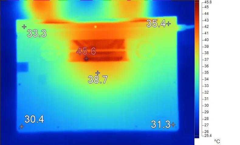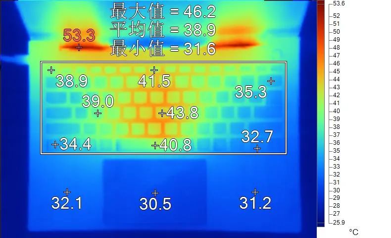 表面温度如上图所示,键盘键帽最高43.8℃出现在键盘H键上,WASD键为39℃,方向键32.7℃。左腕托温度为32.1℃,背面中心点38.7℃。