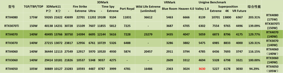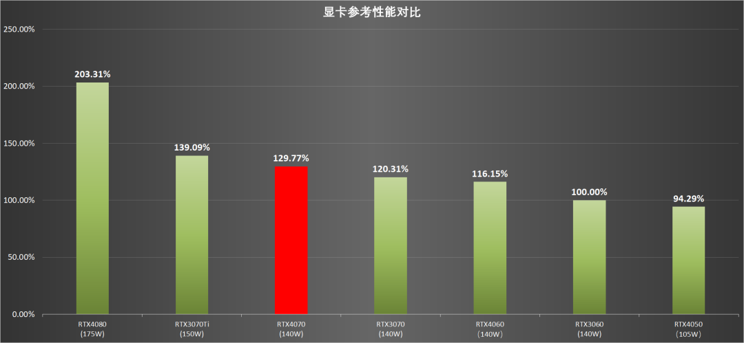 从跑分中我们可以看出,这张140W的RTX4070距离同功耗的RTX3070Ti还有一定的差距,相比同功耗的RTX3070约提升了8%。