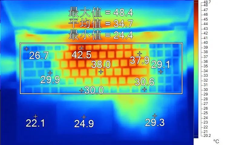 表面温度如上图所示,键盘键帽最高42.5℃出现在功能键F7上,WASD键附近约为29.9℃,方向键30.6℃。左腕托温度为22.1℃。