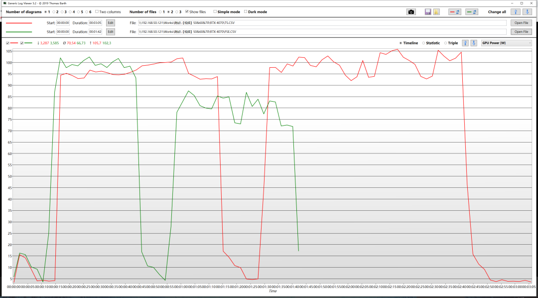 以上图为例,在Time Spy项目中,全程功耗都没有高于105W,而在负载更低的Fire Strike Extreme中,第二个场景中的功耗甚至没有超过90W。
