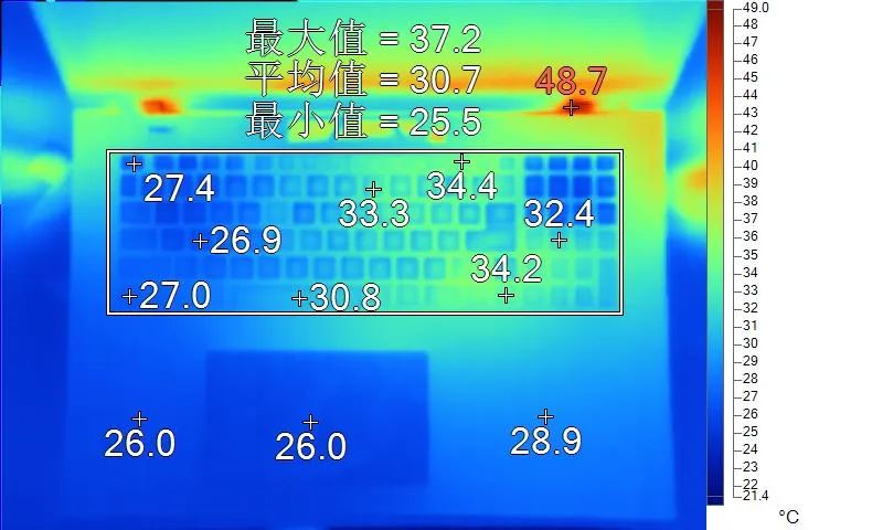 表面温度如上图所示,键盘键帽最高34.4℃出现在右上角功能键上, WASD键附近约为26.9℃,方向键34.2℃。左腕托温度为26℃。