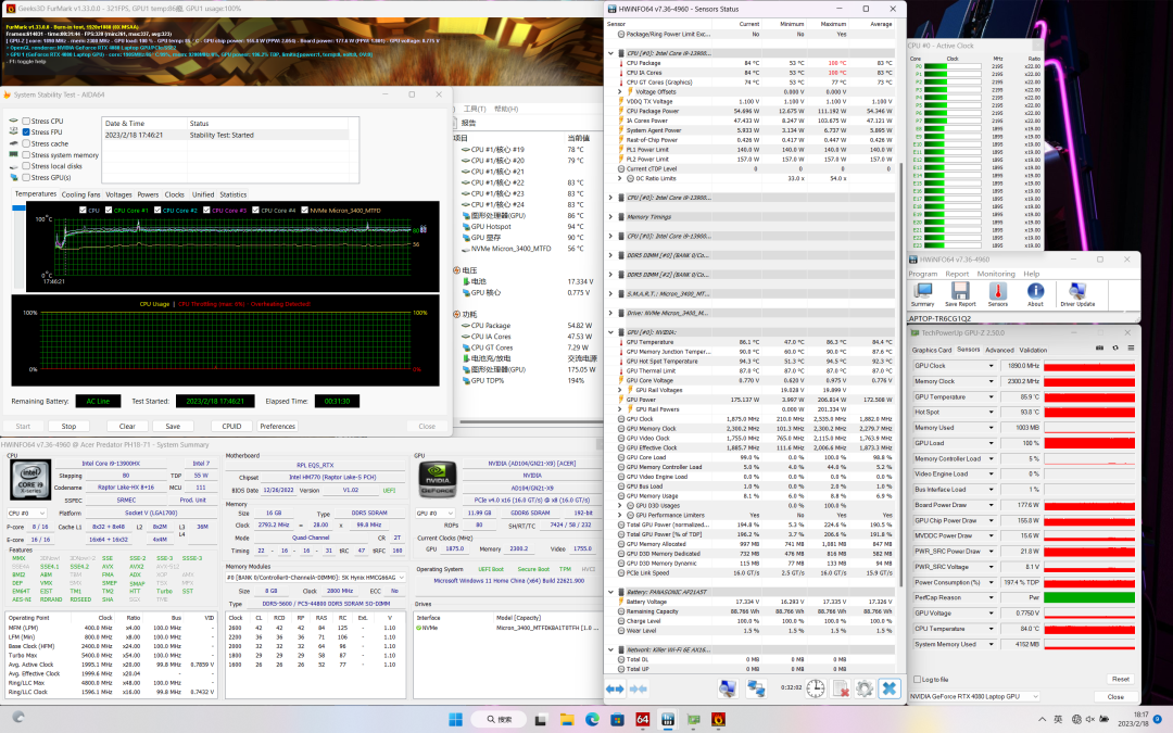 在满载状态下,开启疾速模式,CPU温度最高100℃,稳定在84℃左右,功耗55W,P核频率2.2GHz左右,E核频率1.9GHz左右。