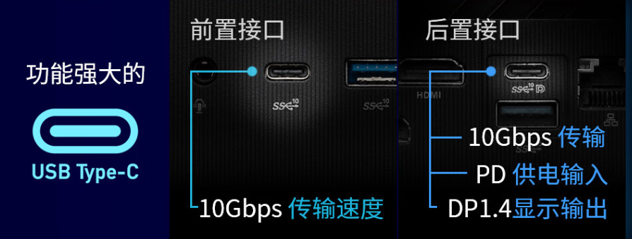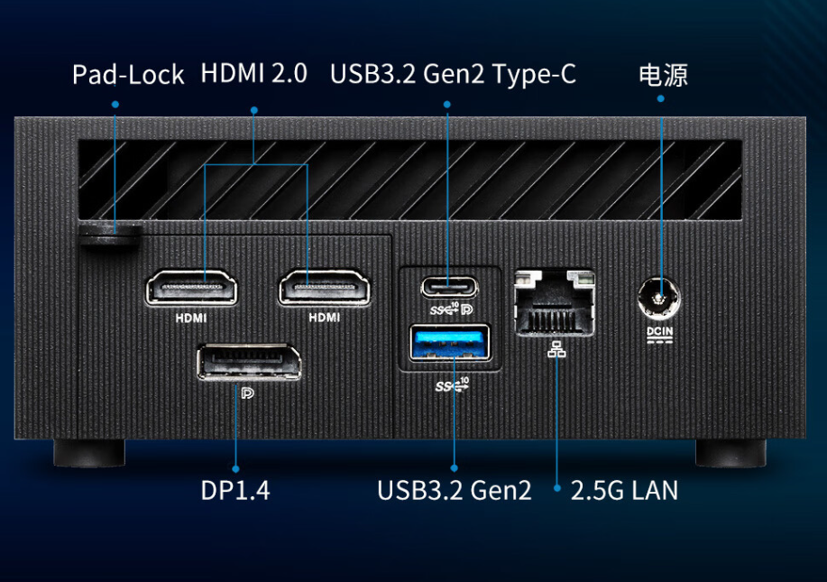 接口方面,该机配有两个 10Gbps USB-C 接口,其中一个支持 PD 供电和 DP 1.4 输出,还配有一个 DP 1.4 接口,以及 2.5G 网口等。