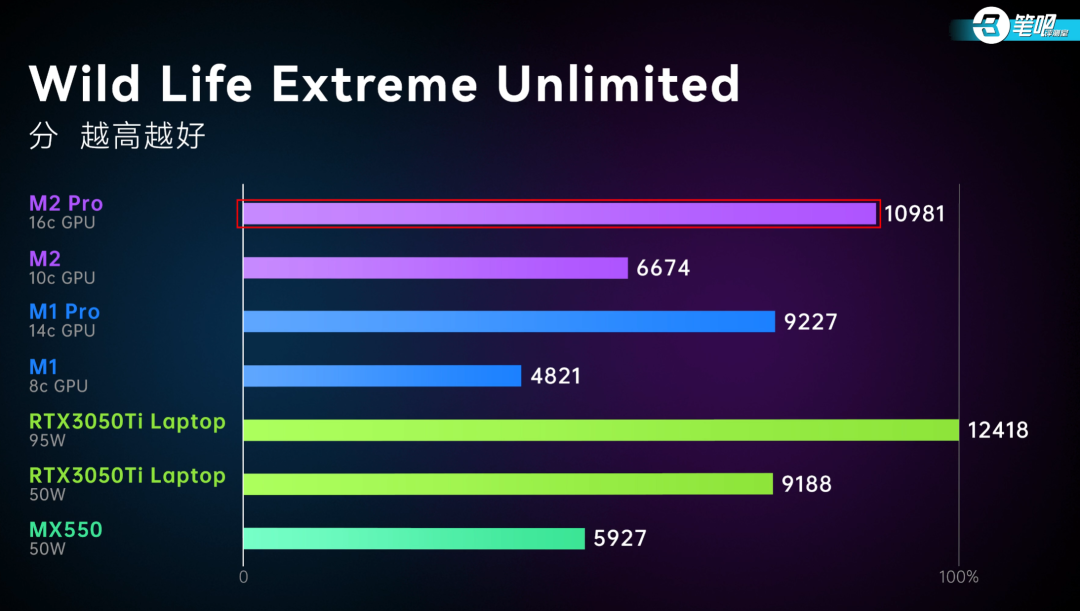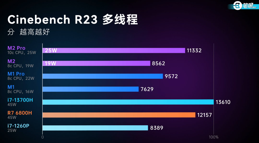 上图是跨平台跑分软件Cinebench R23的多线程成绩,可以看到M2 Pro相比上一代有接近20%的提升幅度,但“绝对性能”已经比不过Intel和AMD的处理器了。