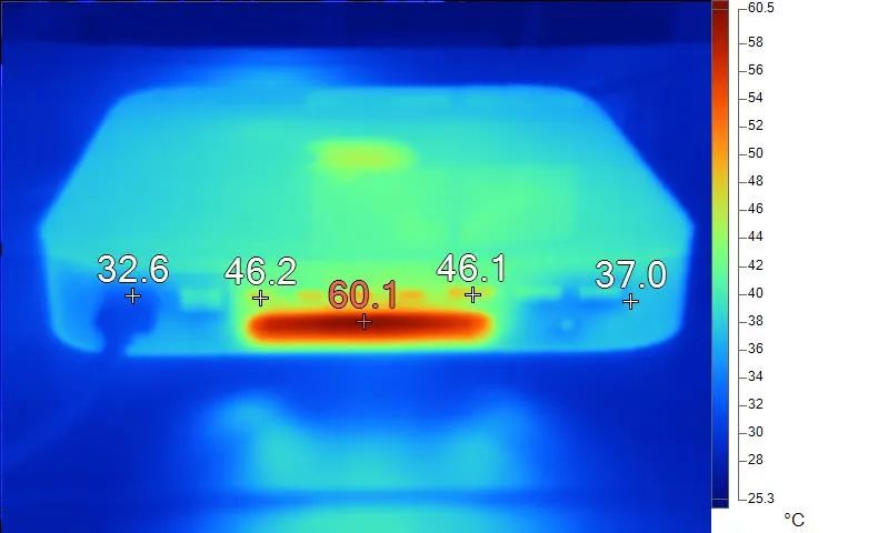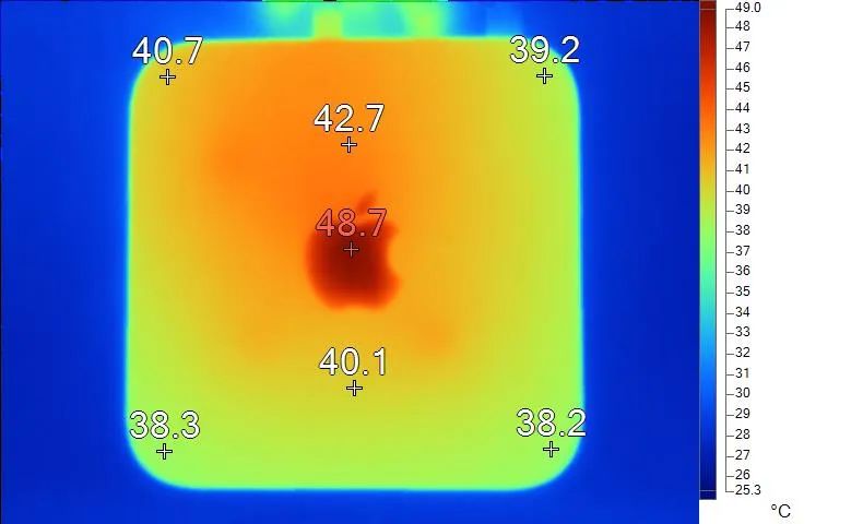 表面温度如上图所示,机身正面超过了40℃,有热感,背面的最高的温度出现在排风口处,机身大部分温度都在40℃左右,机器比M2的版本热很多,但是机身温度也并不算高,而且我们在使用中也不用接触主机。