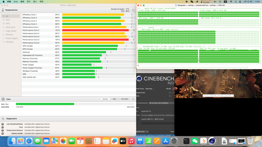 使用R23和Wildlife Extreme进行双烤,在满载状态下,CPU温度最高105℃,功耗约25W,P核频率3.2GHz,E核频率2.4GHz。