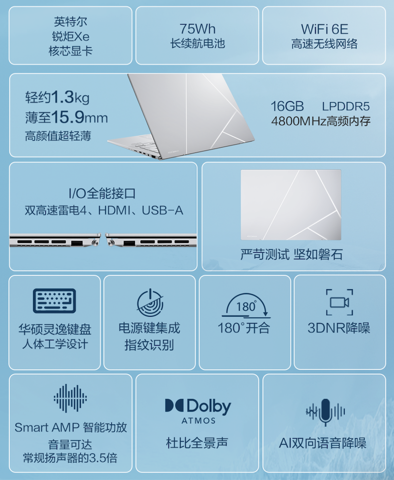 配置方面,华硕灵耀14 2023 轻薄本可选 i5-1340P 和 i7-1360P 两款处理器,12 核 16 线程;标配 16GB LPDDR5-4800 内存和 512GB SSD。