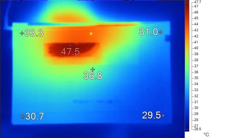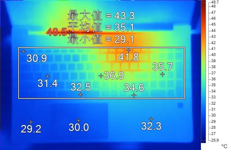 表面温度如上图所示,键盘键帽最高41.8℃出现在键盘功能键F12区域,WASD键为31.4℃,方向键34.6℃。左腕托温度为29.2℃,背面中心点36.8℃。