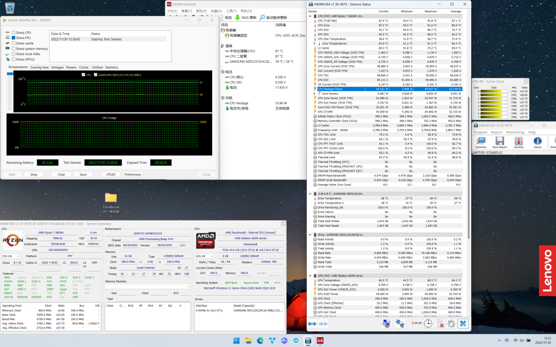 总的来说,ThinkBook 16+锐龙版的散热表现不错,整体温度都控制住了,毕竟这模具可以再压一张RTX2050独显,核显版只有单个核心,散热压力更低。