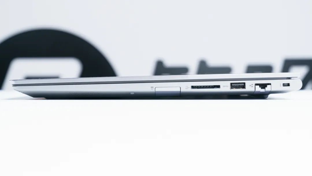 机身右侧有一个SD读卡器(UHS-I)、USB 3.2Gen1 Type-A、USB 2.0隐藏式接口(插鼠标接收器用),以及一个RJ45网线接口。