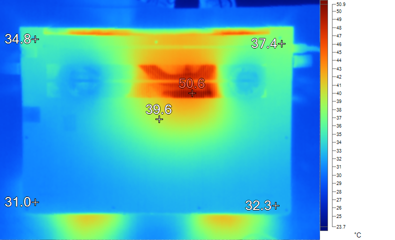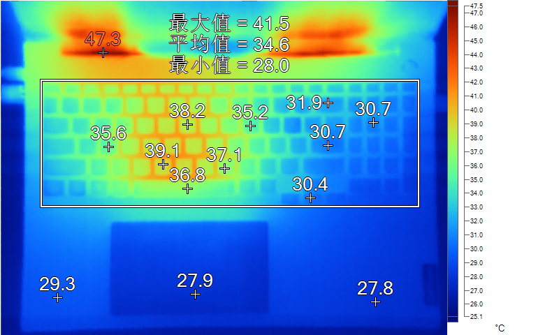 表面温度如上图所示,键盘键帽最高39.1℃出现在键盘中部,WASD键为35.6℃,方向键30.4℃。左腕托温度为29.3℃,背面中心点39.6℃。