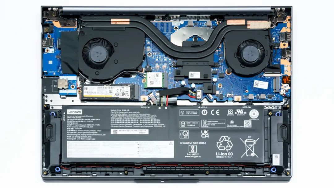 上图是联想ThinkBook 16+的拆机实拍图,双风扇双热管的组合,和ThinkBook 14+相比风扇大了很多。