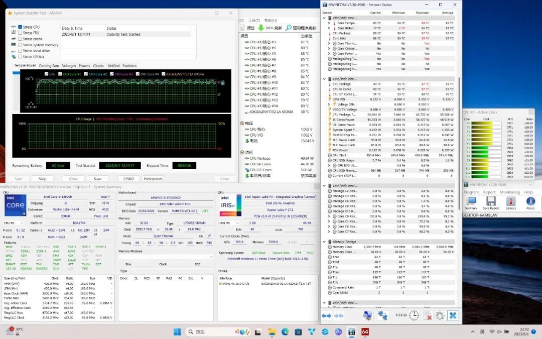 在满载状态下,CPU温度最高97℃,稳定在90℃,功耗50W,P核频率维持在3.8GHz,E核频率维持在3.0GHz左右;