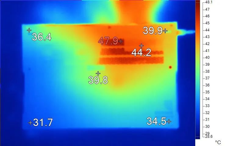 表面温度如上图所示,键盘键帽最高48.2℃出现在键盘左上方数字键区域,WASD键为44.6℃,方向键29.2℃。左腕托温度为31.6℃,背面中心点39.8℃。