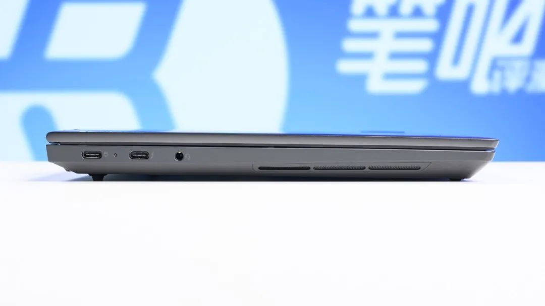 接口方面,机身左侧依次为USB-C 10Gbps(支持PD充电与视频输出)、雷电4、3.5mm音频接口;