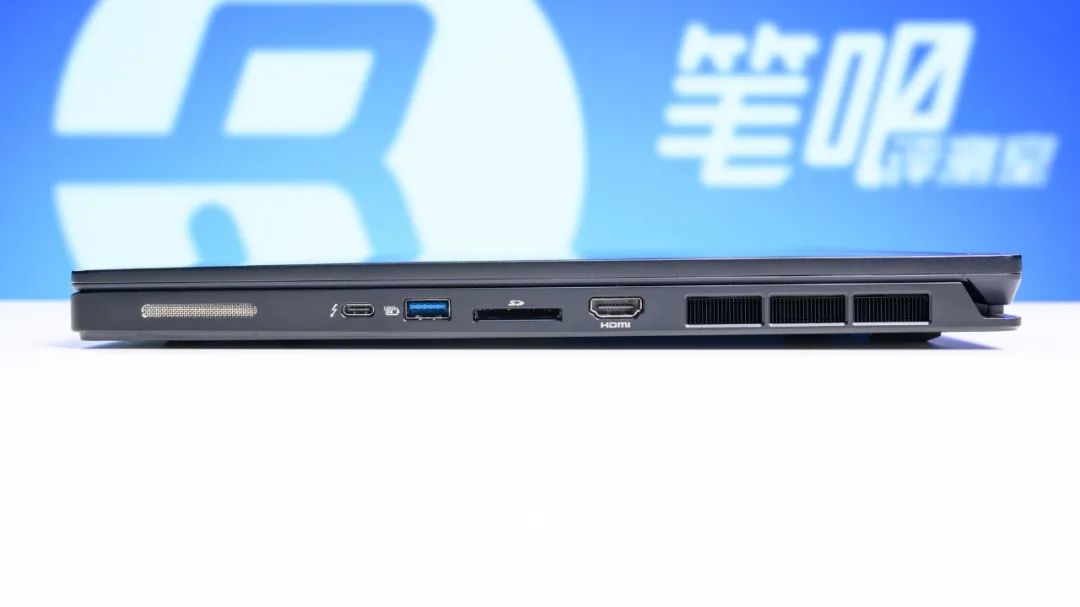 接口方面,机身左侧有一个RJ45网口、USB-A 10Gbps、雷电4(支持PD充电和DP独显输出)以及一个3.5mm音频接口;