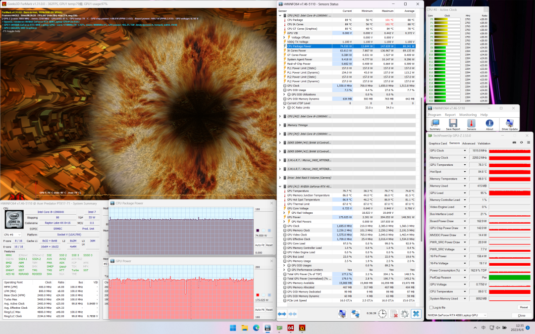 显卡功耗175W,温度79.7℃,频率1695MHz。整机性能释放250W。
