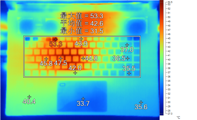 表面温度如上图所示,键盘键帽最高53.3℃出现在“F4”键上,WASD键附近约为45.8℃,方向键35.5℃。左腕托温度为40.4℃。