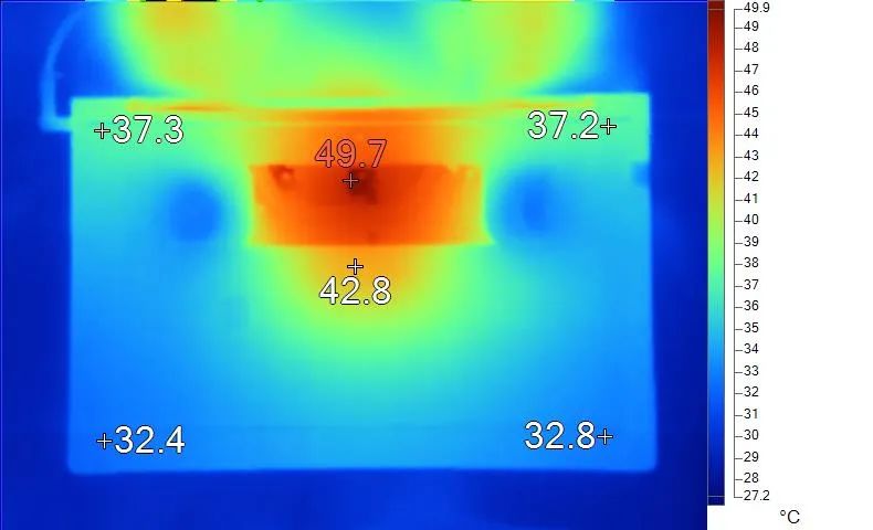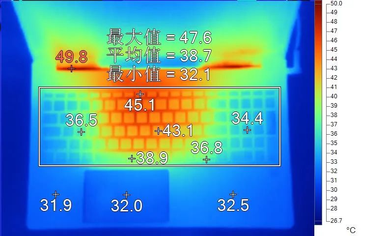 表面温度如上图所示,键盘键帽最高45.1℃出现在键盘顶部功能键区域,WASD键为36.5℃,方向键36.8℃,左腕托温度为31.9℃,背面中心点42.8℃。