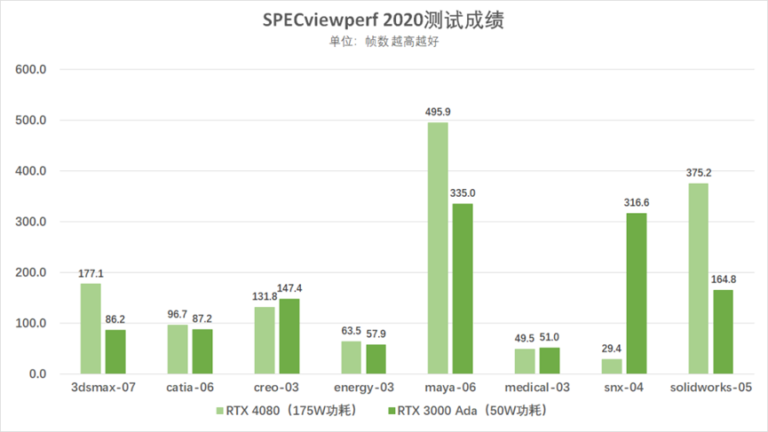可以看到,仅有50W功耗的RTX 3000 Ada在SPECviewperf 2020的大多数项目中,都能够达到甚至超过175W功耗的移动端RTX4080。并且在例如西门子NX项目中,能够有着高达10倍的性能提升。