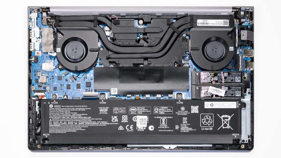 上图是惠普 战99的拆机实拍图,双风扇三热管的组合。