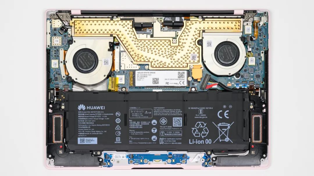 上图是华为 MateBook X Pro 2023 微绒典藏版的拆机实拍图,双风扇加均热板的组合。