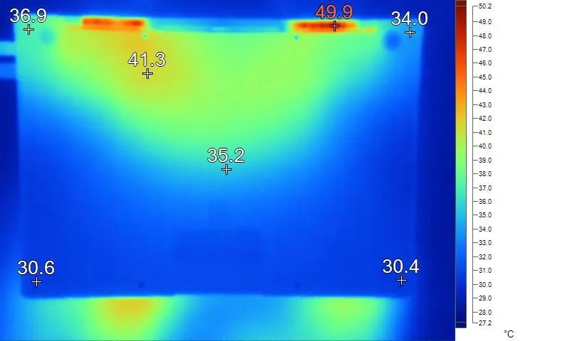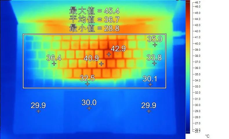 表面温度如上图所示,键盘键帽最高42.9℃出现在“I”键上,WASD键为36.4℃,方向键30.1℃。左腕托温度为29.9℃,背面中心点35.2℃。