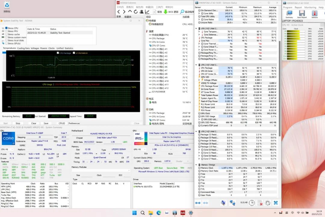 在满载状态下,开启高能模式,CPU温度最高95℃,稳定在78℃,功耗30W,P核频率维持在3.5GHz,E核频率2.8GHz。