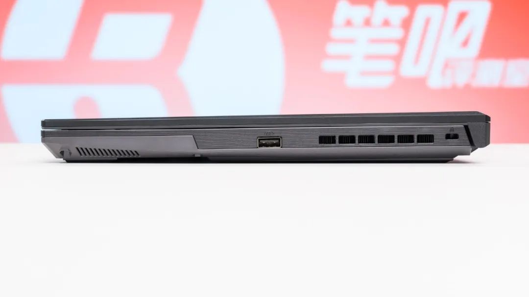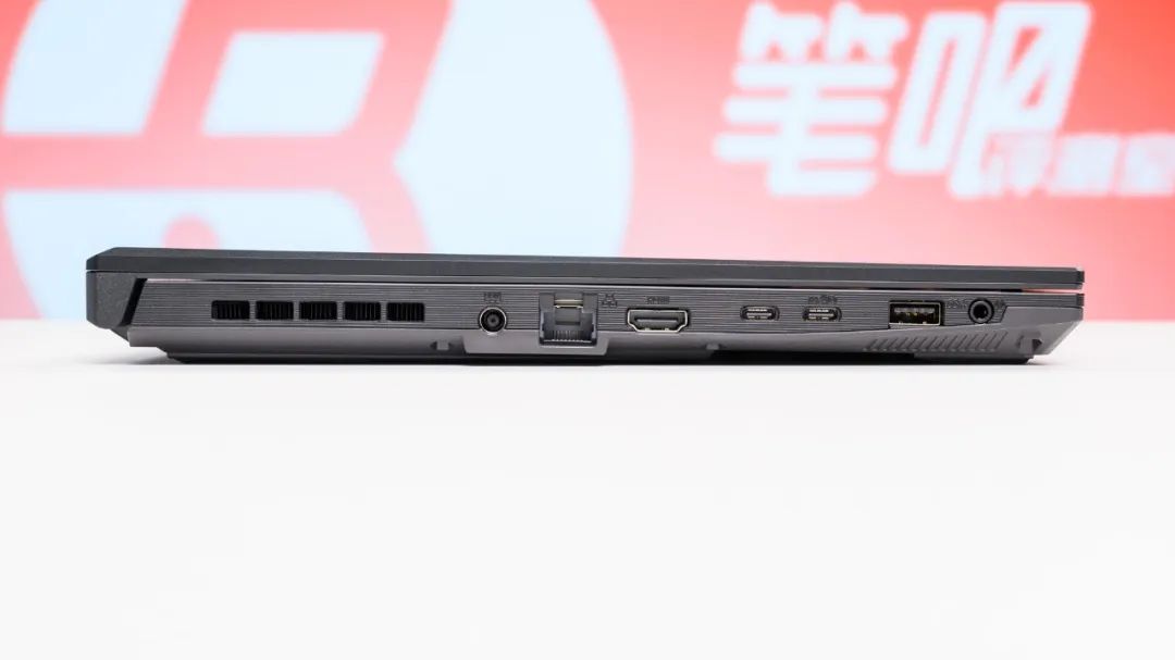 接口方面,机身左侧有RJ45千兆网线接口、HDMI2.1(支持8K 60Hz/4K 120Hz)、USB-C 10Gbps(支持DP集显输出)、USB-C 10Gbps(支持DP1.4独显输出以及PD充电)、USB-A 5Gbps,以及一个3.5mm音频接口;