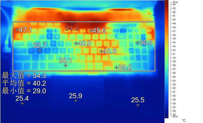 表面温度如上图所示,键盘键帽最高47.1℃出现在“ESC”键上,WASD键附近约为32.7℃,方向键39.2℃,左腕托温度为25.4℃。