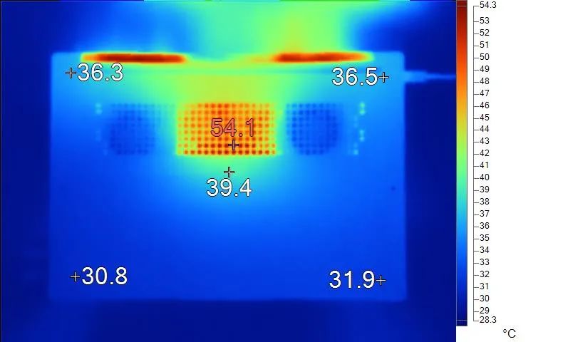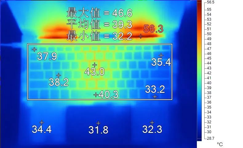 表面温度如上图所示,键盘键帽最高43℃出现在键盘中心区域,WASD键为38.2℃,方向键33.2℃。左腕托温度为34.4℃,背面中心点39.4℃。