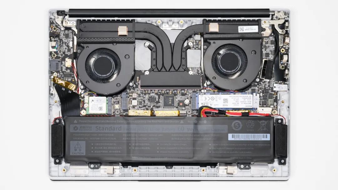 上图是机械革命 无界14+的拆机实拍图,双风扇三热管的组合。
