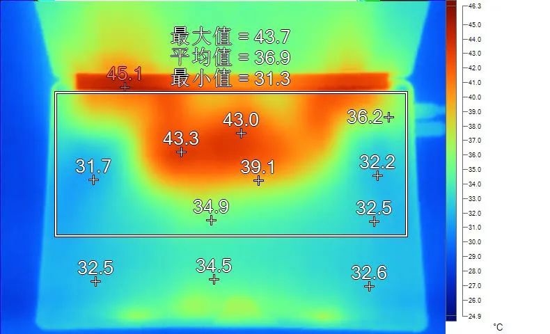 常规双屏模式下,下屏使用模拟键盘和触摸板,表面温度如上图所示,下屏最高43.3℃出现在“R键”上,WASD键为31.7℃,方向键32.5℃。左腕托温度为32.5℃,背面中心点39.9℃。