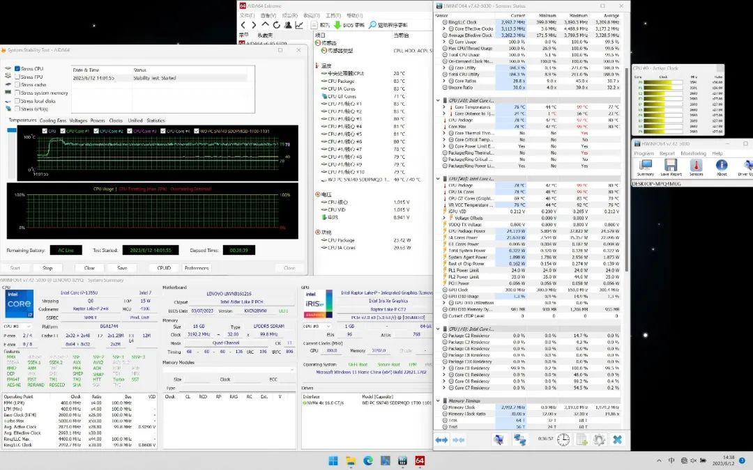 竖屏模式下(转轴垂直于桌面),CPU温度最高81℃,稳定在69℃,功耗15W,P核频率维持在3.0GHz,E核频率2.2GHz。