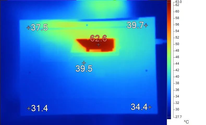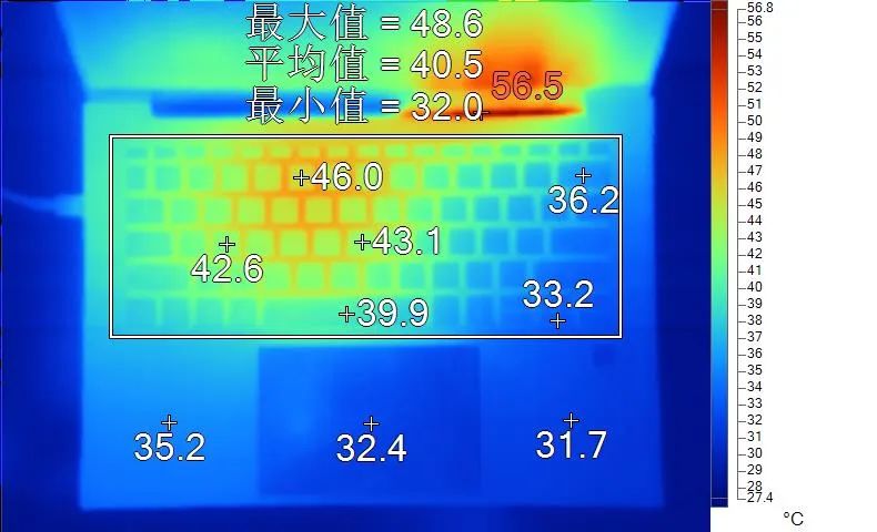 表面温度如上图所示,键盘键帽最高46℃出现在键盘中上偏左区域,WASD键为42.6℃,方向键33.2℃。左腕托温度为35.2℃,背面中心点39.5℃。