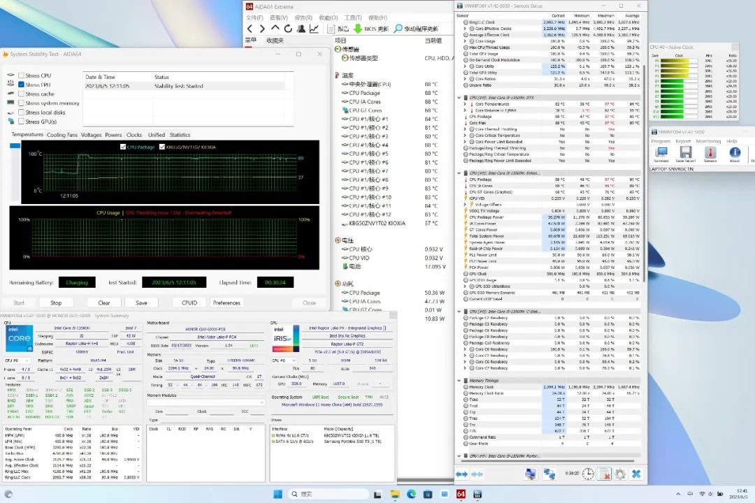 在满载状态下,开启高能模式,CPU温度最高97℃,稳定在88℃,功耗50W,P核频率维持在3.6GHz,E核频率2.9GHz。