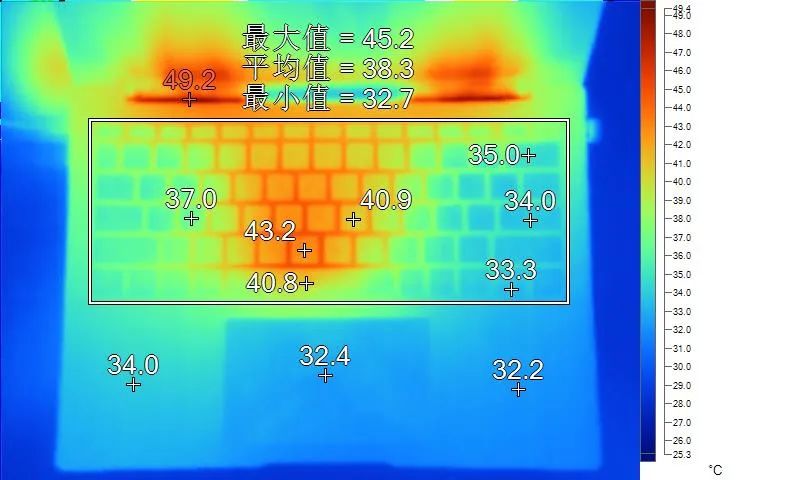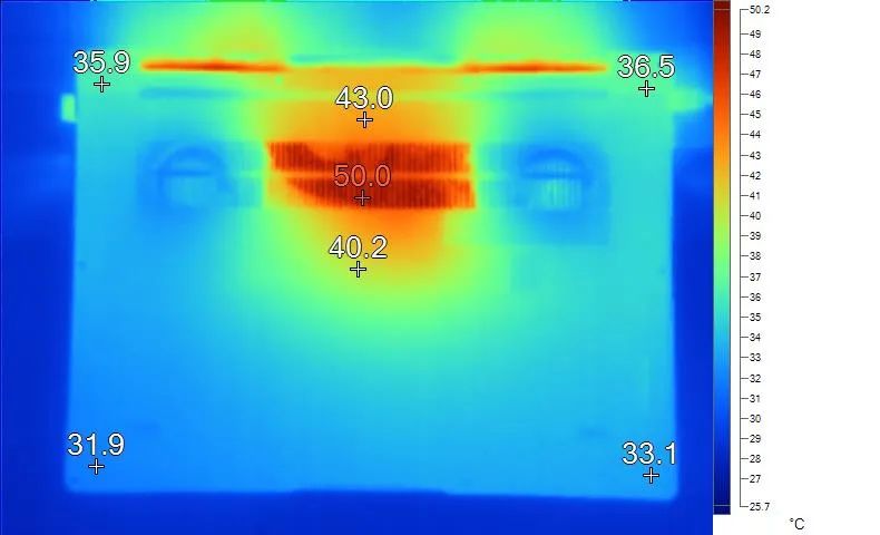 表面温度如上图所示,键盘键帽最高43.2℃出现在“B”键上,WASD键附近约为37.0℃,方向键33.3℃。左腕托温度为34.0℃。背面中心点40.2℃。