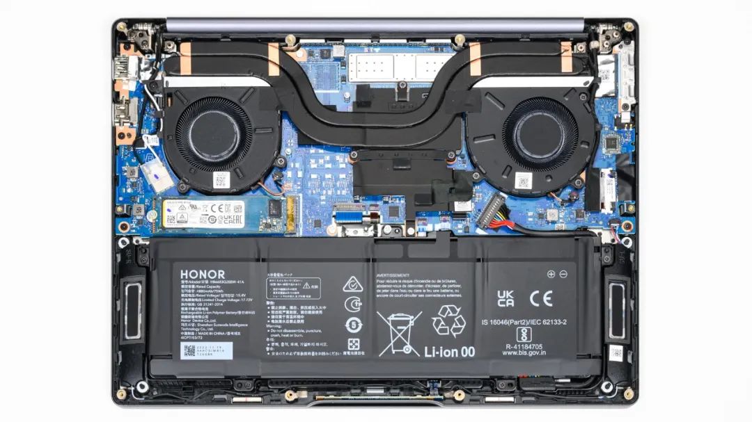上图是荣耀 MagicBook 14的拆机实拍图,双热管双风扇的组合。
