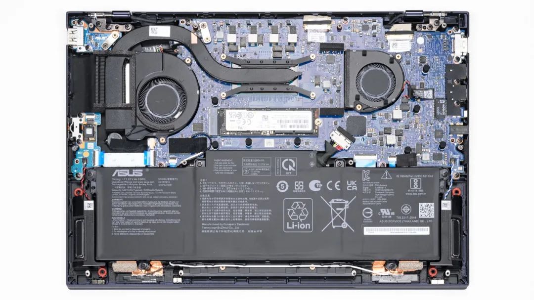 上图是华硕 破晓Air的拆机实拍图,双风扇单热管的组合,其中一个风扇用于在机身内部形成风道,属于比较少见的设计。