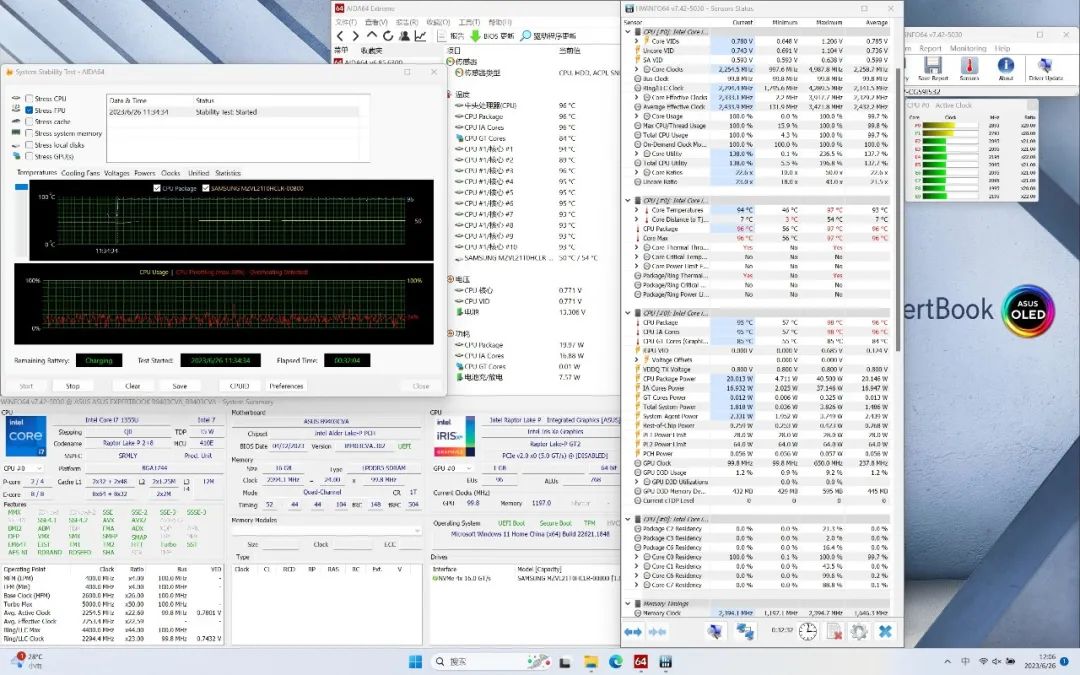 在满载状态下,开启高效模式,CPU温度最高98℃,稳定在95℃,功耗20W,P核频率维持在3.3GHz,E核频率2.6~2.7GHz。