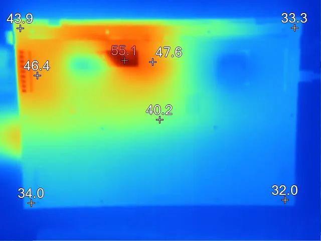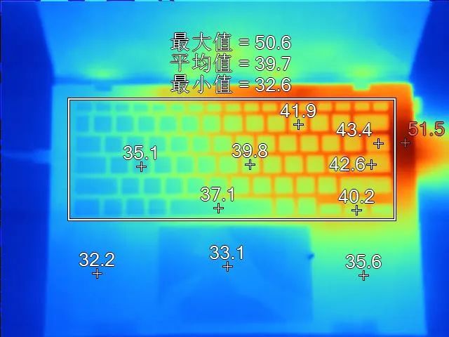 表面温度如上图所示,键盘键帽最高43.4℃出现在“”键上,WASD键为35.1℃,方向键40.2℃。左腕托温度为32.2℃,背面中心点40.2℃。