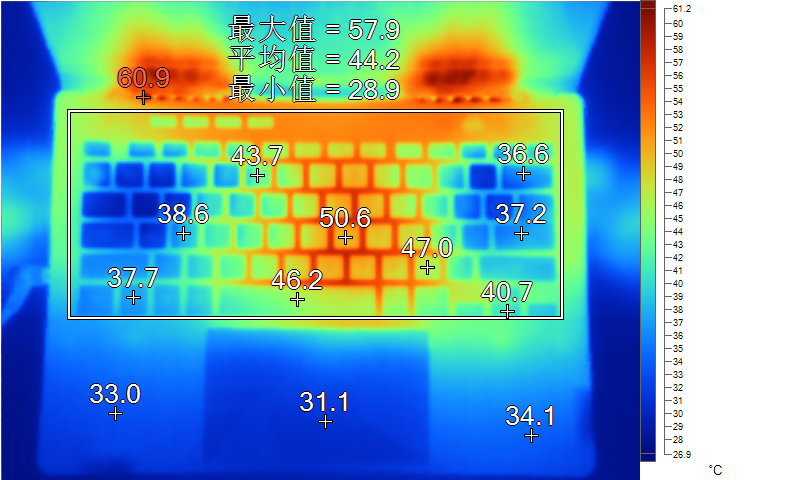 表面温度如上图所示,键盘键帽最高50.6℃出现在“J”键上,WASD键附近约为38.6℃,方向键40.7℃。左腕托温度为33.0℃。