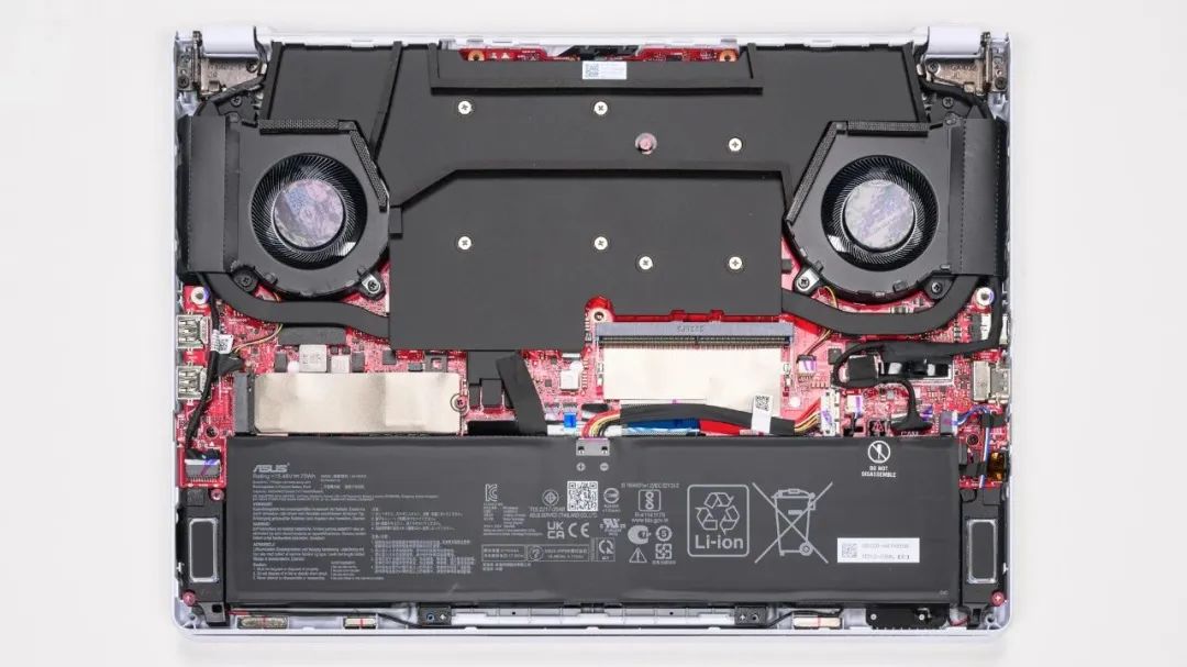 上图是ROG 幻14的拆机实拍图,双风扇加均热板的组合,其中CPU为液金导热。