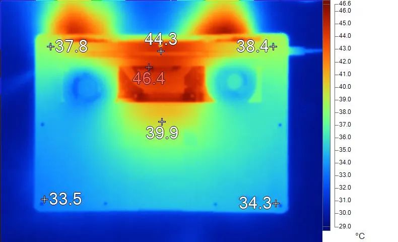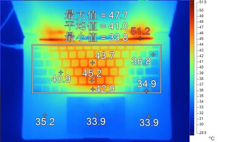 表面温度如上图所示,键盘键帽最高45.2℃出现在键盘中下区域,WASD键为40.9℃,方向键34.9℃。左腕托温度为35.2℃,背面中心点39.9℃。