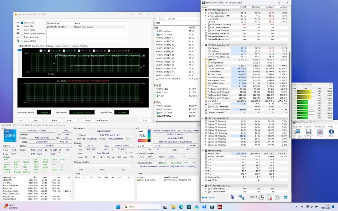 在满载状态下,按Fn+K开启“极速模式”,CPU温度最高97℃,稳定在89℃,功耗45W,P核频率维持在3.8GHz,E核频率2.9GHz。