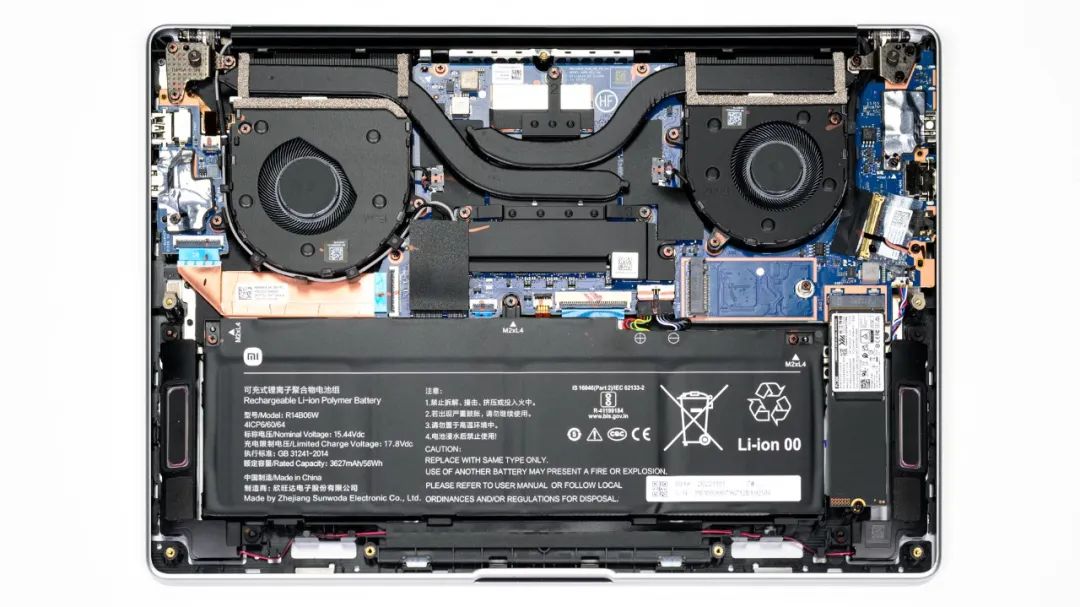 上图是红米RedmiBook 14 2023的拆机实拍图,双风扇双热管的组合。