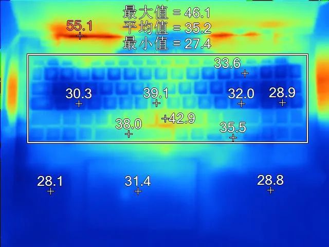 表面温度如上图所示,键盘键帽最高42.9℃出现在“M”键上,WASD键附近约为30.3℃,方向键35.5℃。左腕托温度为28.1℃。