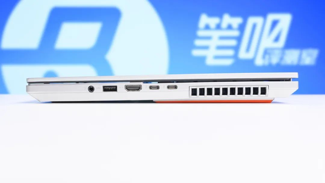 机身右侧有两个雷电4(支持PD充电和DP独显视频输出)、HDMI2.1、USB-A 5Gbps、3.5mm音频接口。