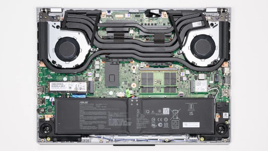 上图是华硕无畏Pro16 2023旗舰版的拆机实拍图,五热管双风扇的组合。
