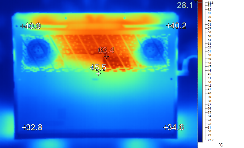 表面温度如上图所示,键盘键帽最高51.2℃出现在“6”键上,WASD键附近约为45℃,方向键39.9℃。左腕托温度为30.4℃。背面中心点温度45.5℃。